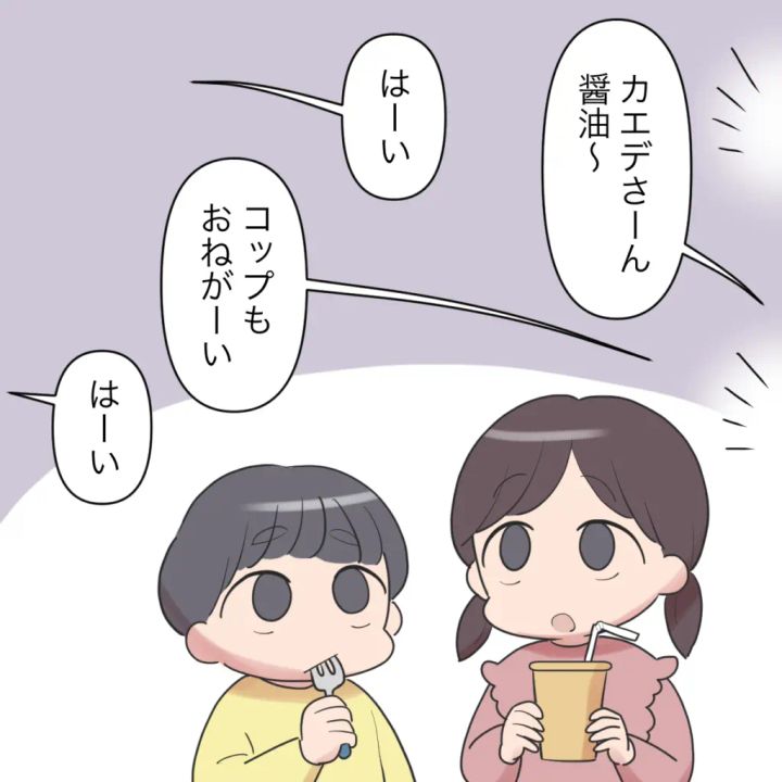 この家の人たちは自分で動くという考えが1ミリもないので、思いつくとすぐ「醤油~」「コップ」と私に言いつけます。そのやりとりを不思議そうに聞いていた子ども達。