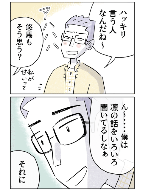 伯母から「母とは対等に話すべき」と言われたことを凜から聞いた彼は、その潔さに思わず笑みをこぼします。けれどすぐに、「どんな親でも、他人から悪く言われるのはいい気がしないよ」と優しくフォローを入れるのでした。