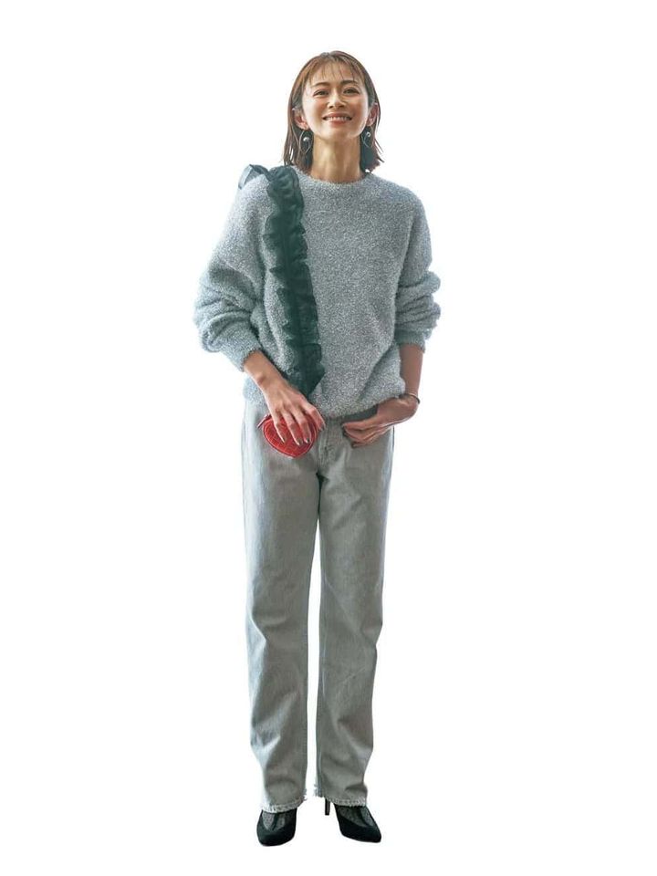 ニット¥23,980(ネイヴ)デニムパンツ¥42,900(エー・ゴールド・イー/シチズンズ・オブ・ヒューマニティ)バッグ¥10,450(ダイアナ/ダイアナ 銀座本店)ブーツ¥104,500(ペリーコ/アマン)ピアス¥155,100バングル¥105,600(ともにHirotaka/Hirotaka 表参道ヒルズ)