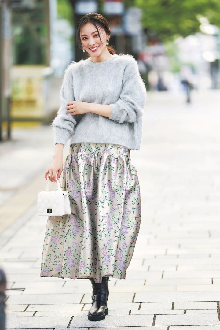ふわふわなシャギーニットは、甘派40代にとって冬の定番アイテム。肌触りの良い柔らかな素材に誰もがトリコに♡キュートな花柄スカートと合わせれば、フェミニン度MAXなコーデに仕上がります。