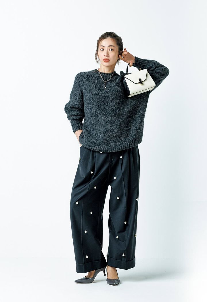 ニット46,200(サクラ/インターリブ)パール付きパンツ¥82,500(メイメイジェイ/エスケーシー)バッグ¥561,000(ヴァレクストラ/ヴァレクストラ ジャパン)パンプス¥22,000(オデット エ オディール/オデット エ オディール 新宿店)ピアス¥22,000(バルブス/ズットホリック)ネックレス¥13,750(ポピー・ケー/ロードス)