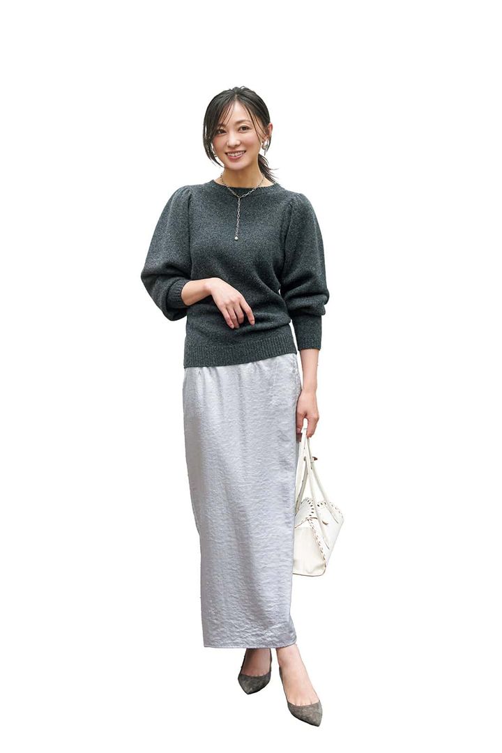 スカート¥29,700(ヌキテパ/パサンド バイ ヌキテパ)ニット¥8,990(アンフィーロ/アンフィーロ〈オンワード樫山〉)バッグ¥16,500シューズ¥29,700(ともにダイアナ/ダイアナ 銀座本店)ピアス¥12,100(カラ・ユ/ショールーム ロイト)リング¥21,450(ココシュニック オンキッチュ/ココシュニック)