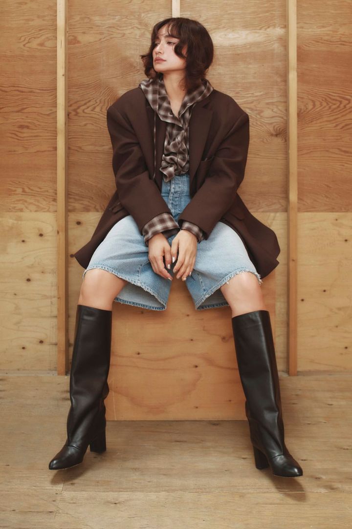 ジャケット¥66,000(ザハイライツ)、フーディーシャツ¥25,300(プランクプロジェクト/プランクプロジェクト 青山店)、デニムハーフパンツ¥40,700(ゲミニー/ウィム ガゼット ルミネ新宿店)、ブーツ¥110,000(ネブローニ)