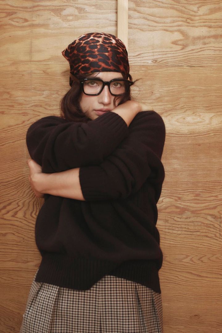 ニット¥130,900、チェックパンツ¥75,900(共にドゥロワー/ドゥロワー 青山店)、スカーフ¥16,500(マニプリ)、メガネ¥54,780(オリバーピープルズ/ルックスオティカジャパン カスタマーサービス)