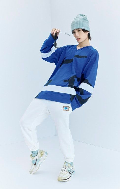 トップス¥15,400、パンツ¥10, 010、スニーカー¥23,650/以上すべてナイキ スポーツウェア(ナイキ カスタマーサービス)、ニット帽¥7,700/オーバーライド(オーバーライド 神宮前店)、サングラス¥5,900/RIM(JINSカスタマーサポートセンター)、ネックレス¥4, 620/ミミサンジュウサン(サンポークリエイト)、ソックス¥4,290/ホイサム