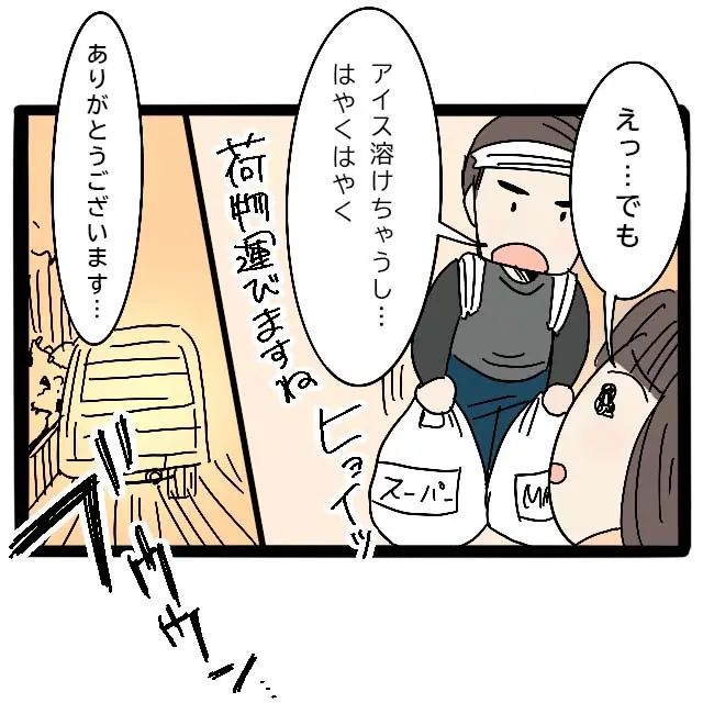 買い物を済ませて帰宅したものの、義母たちは一向に帰ってきません。アイスや生ものもあるから早く帰ってきてほしいと夫に連絡しますが応答はなく、ユミさんはクーラーボックス買い行こうか迷い始めます。そんな時、心が限界を感じたのか、ユミさんの目から涙がこぼれました。だけどこのまま待っていても、義母に何も対処しなかったことを責められるだけ。クーラーボックスを買いに行こうと立ち上がろうとしたその時、お寿司屋さんが昼間の桶を回収しに来ました。玄関に座って泣いているユミさんを見て驚くお寿司屋さん。ユミさんが嗚咽まじりに泣きながら事の経緯を話すと、お寿司屋さんは「店に発砲スチロールと氷あるんで一緒に行きましょう」と買い物袋を持ち上げると、急いでお店に送ってくれました。