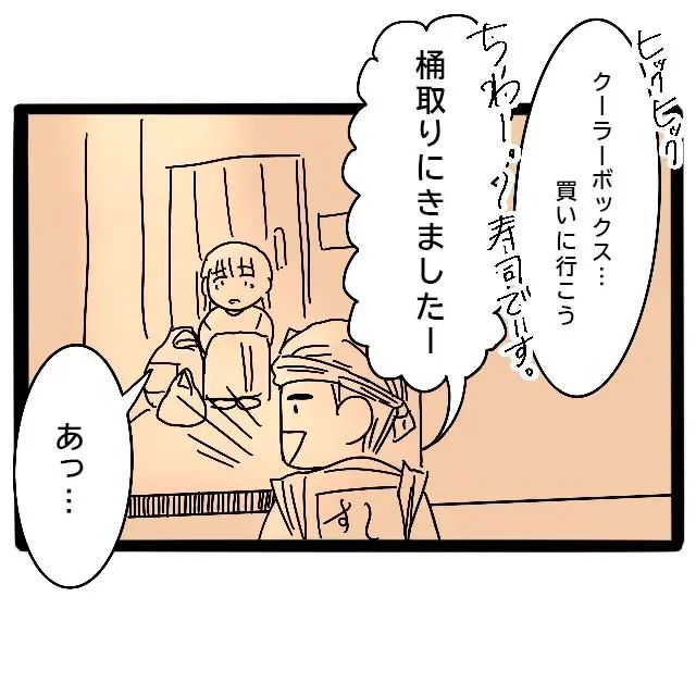 このまま待っていても、義母に何も対処しなかったことを責められるだけ。「クーラーボックス買いに行こう」と立ち上がろうとしたその時、「桶取りにきました!」と大きな声が。お寿司屋さんが、昼間の桶を回収しに来たようです。