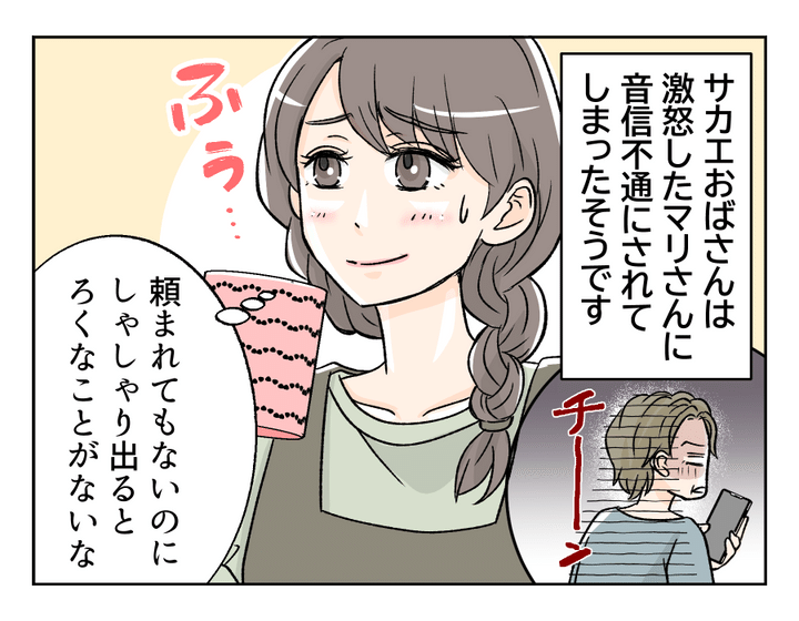 残念ながらサカエおばさん、「反省」はできていなかったようですね……。ますます関係が悪くなることが目に見えているのに、ターゲットを弟家族からマリさんに変え、またもや「教育」しにいってしまったようです。案の定、娘とは音信不通になり、弟一家とも不仲に。また、ご近所さんや友人からも、その性格が原因で距離を置かれ始めているそうです。いつか反省できる日がくるといいのですが、この調子ではまだまだ先のようですね。そしてサカエおばさんの末路を聞いたミナさんは、相手より優位に立とうなどと考えず、思いやりをもって接することの大切さをあらためて実感したのでした。