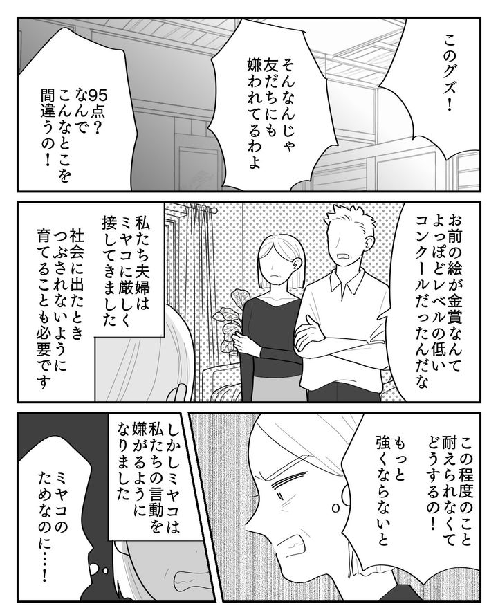 もっと冷酷に、調子に乗らないよう叩きのめさないと……。それがミヤコのためになると、私たちは信じていました。やがて家を出たミヤコが結婚すると言い出しました。私たちは両家の顔合わせに出席し、相手の両親と対面しました。