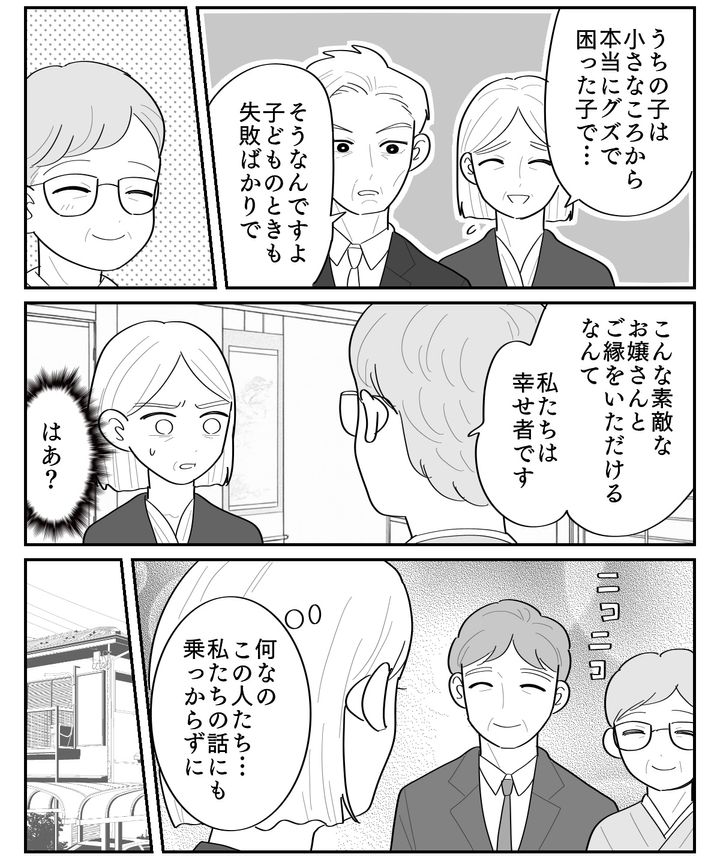 私たちはミヤコの出来の悪さや失敗談を次々と語りました。こういうときは自分の娘のことを下げておくのがマナーというものでしょう。けれど私たちの話を、相手の両親はまるで耳に入っていないかのように受け流しました。