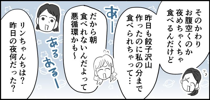 「リンちゃんが食べたがらないんですよね? うちも下の子がまったく朝食べないから困っていて。朝食べないと元気が出ないと言っても「朝から食べられない」ってなにも食べずに学校に行く日もあるんですよ!」みんなの話に圧倒されていた私はそれを聞いて安心しました。(よかった! 朝ごはん食べない子もいるんだ!)