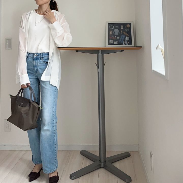 シルエットがきれいなデニムは、カジュアルスタイルを大人っぽく見せる必須アイテムです。トップスはシアーな素材感のシャツで、デニムのカジュアルさを品よく中和しています。やわらかい素材のシャツをあえてラフに羽織ることで、抜け感のある雰囲気を演出。バッグのロンシャンと濃いブラウンのパンプスを合わせることで、全体の配色をベーシックカラーで統一し、きれいめな印象を保っています。デニムという普遍的なアイテムも、合わせるシャツの素材感や小物の選び方で、こんなにも新鮮で心地よいスタイルになるというお手本です。