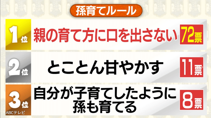 そして72票を獲得しダントツで1位になったのは、「親の育て方に口を出さない」。祖父母たちいわく、「今は自分のやり方が通る世の中じゃない。あんなんしたらアカンよとか言わない」、「パパとママ優先。娘がいいと言うことしかしない」、「私はこう思うとかは言わないようにしてる」とのこと。あるおじいちゃんが「親は親の考え方があってやってる訳だから、それに対して背景も何もわからないくせに言ったって仕方ないじゃない。失敗ばっかり言うんじゃなくて、ダメでももっと頑張れば出来るんだ。頑張れでいいんじゃないですか」と話すと、山内は「古いこと言ってそうで、最新のこと言ってた」と感心していた。