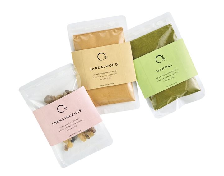 フレグランスブランド〈チエ〉は、世界各地で古くから尊ばれてきた香木に着目。天然の香原料のみを使ったお香を展開する。左から、深い落ち着きを感じさせる「フランキンセンス」のレジン、芳醇な甘さの「サンダルウッド」と清涼感のある「ヒノキ」のパウダー。いずれも皿の上に載せて直接火をつけ、炎を消してくゆらせると優しい香りが広がる。