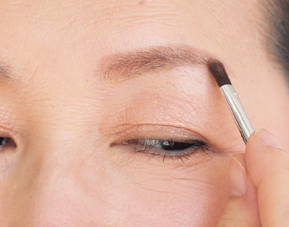 ピンクベージュや淡いベージュを眉尻から眉頭へ、そして眉頭から眉尻に毛流れを整えながらつけていく。「眉の存在感を消すと、顔が一気に垢抜けて見えます!」