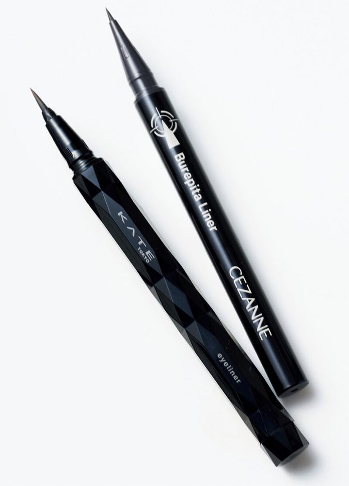 (左)抜け感のあるグレージュ。独自開発の筆先で繊細な線が描ける。ケイト スーパーシャープライナーEX4.0 GY-1 ¥1,430(編集部調べ)/カネボウ化粧品