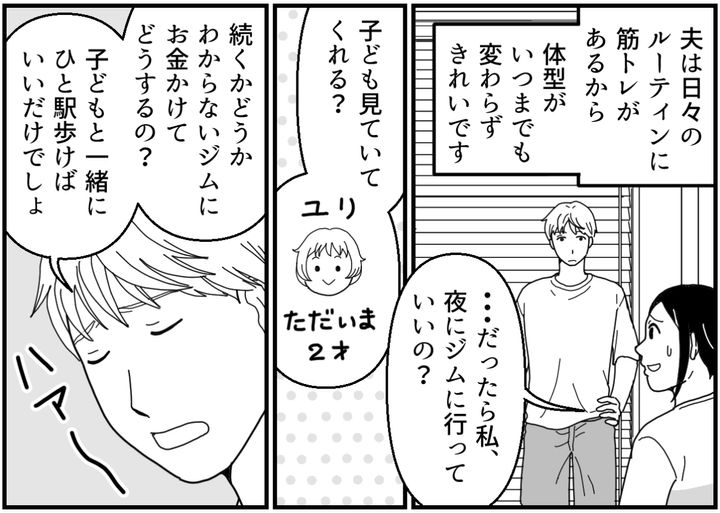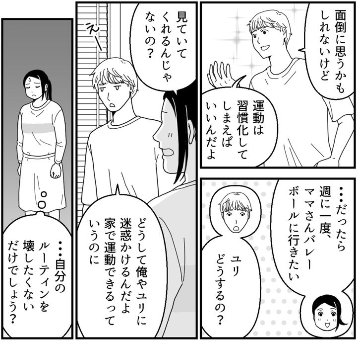 夫は自分を基準にしか考えられず、他人のペースには文句ばかり。「運動は習慣化してしまえば太らないんだよ」とか、「健康的なルーティンを自分で作り出さないと」とか、私に向かって得意げに主張してきます。ユリがいるのに運動しろと?