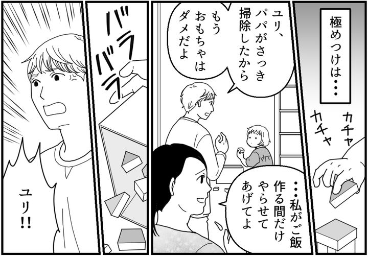 ユリは絶賛イヤイヤ期だし、そのペースに合わせなきゃいけないことはどうしてもあります。ユリがおもちゃを出すのは許さないって、私のご飯の準備が遅れても許さないくせに……。私はだんだん、そんな夫に息苦しさを感じるようになりました。