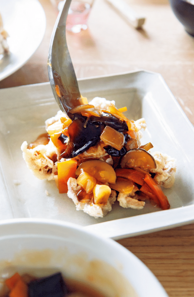 5. 4 を180℃に熱した油で3~4分揚げ、油をきり、器に盛る。好みで、3をかけたりつけたりして食べる。
