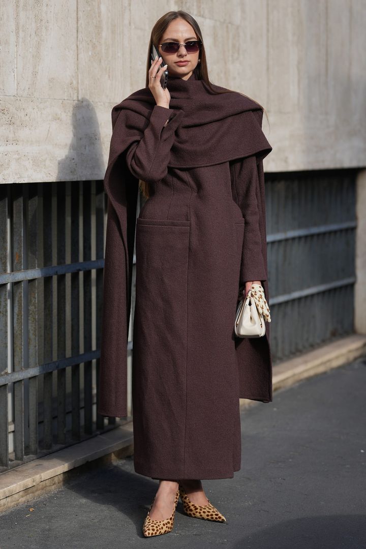 深みのあるブラウンのスカーフコートは、首元に生まれるゆったりとしたドレープでとびきりシックな印象に。足元には旬のレオパード柄を添えて、野性味のあるスパイスをプラス。