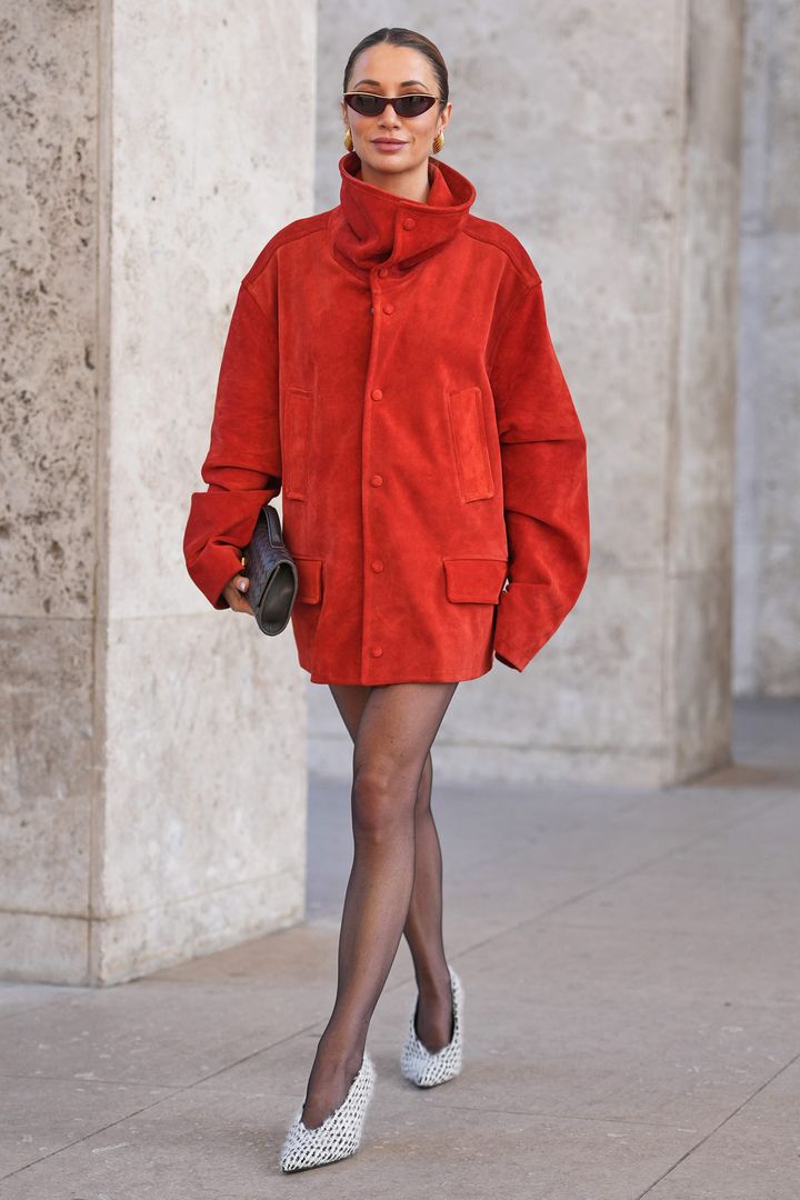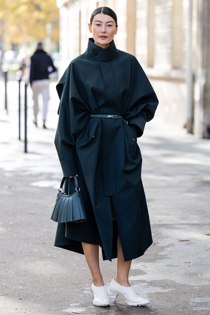 首を覆い隠すようなハイネックアウターの人気が急上昇中。一見アクティブなゆったりサイズのジャケットは、潔い脚見せでシンプル&力強く着こなすことで上品モードに昇華できる。