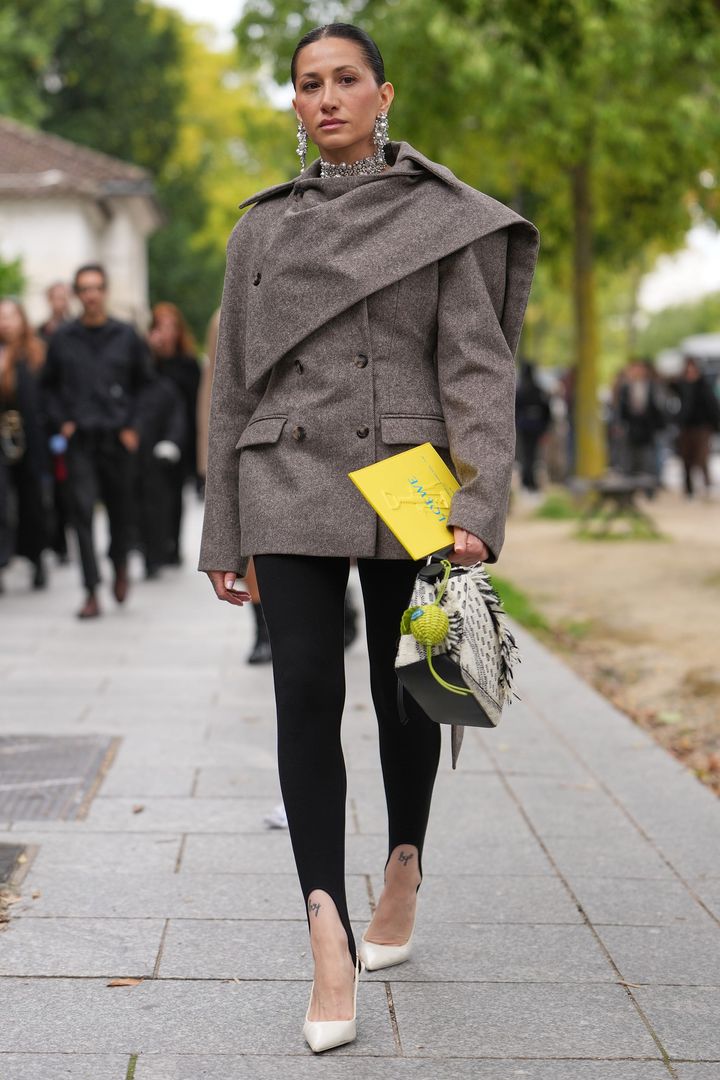 スカーフとアウターが融合した万能デザインも人気。スカーフジャケットのボクシーなシルエットを生かすべく、ボトムにはトレンカタイプのレギンスを選んでコンパクトに引き算。