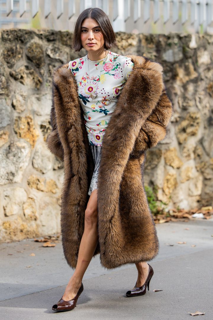 フェイクファーロングコート×花柄トップのおすすめコーディネート
