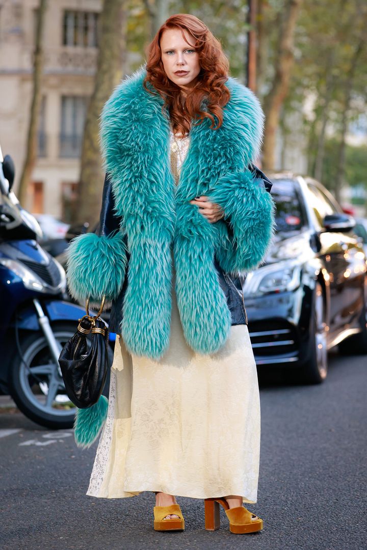 襟や袖口にボリューム満点のフェイクファーをあしらったトリミングコートも見逃せない。レースワンピースで甘さをプラスしつつ、インパクト大のカラーで唯一無二の存在感を発揮して。