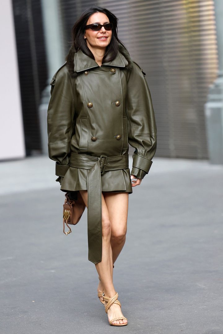 金ボタンやエポーレットなど、ミリタリーな雰囲気が漂うレザージャケット。ローウエストかつミニワンピース風に取り入れることで、大人っぽい渋さとフェミニンムードを共存させて。