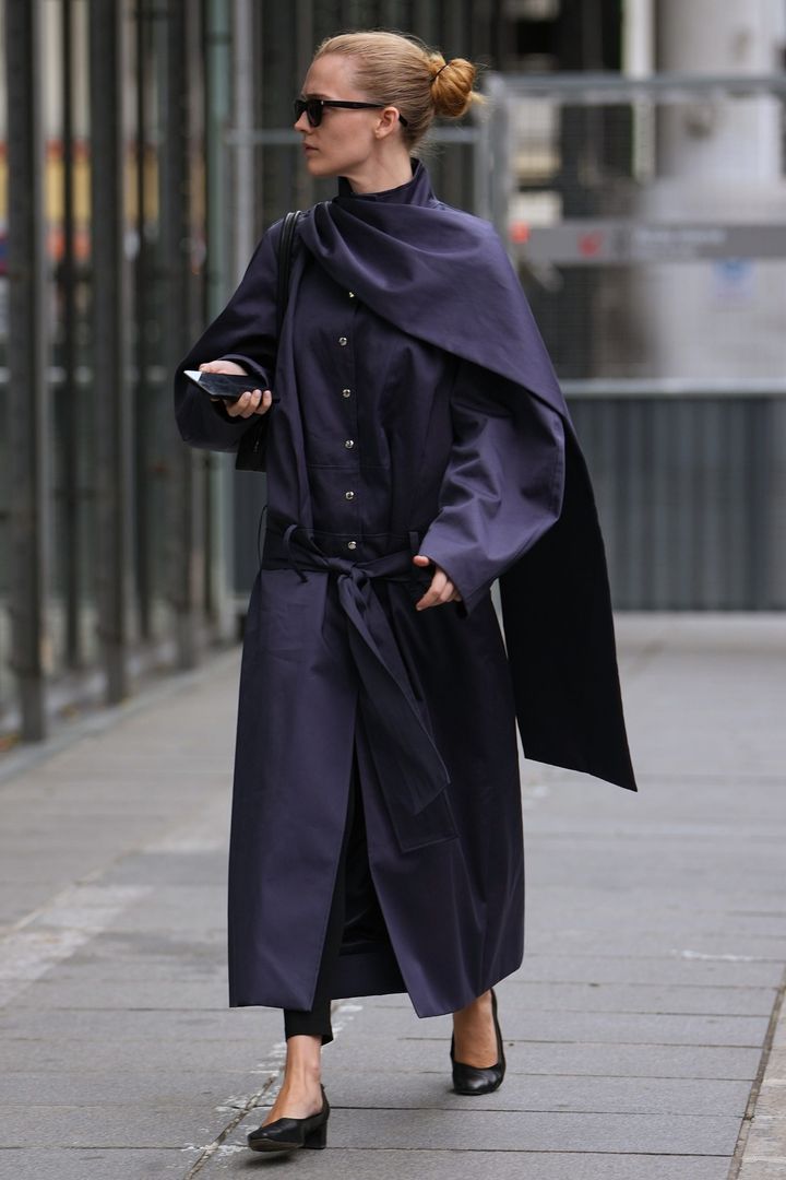 レインコート風のハリのある素材も登場。夜空のようなネイビーに、シルバーのボタンがよく映える。細身のパンツとパンプスで、パリジェンヌらしい抜け感を演出するとスタイリッシュ。