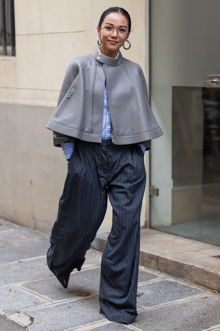 前身頃がふわっと広がったレザージャケットは、ライダースジャケットとケープを融合させたハイブリッドデザインが魅力。知的&スマートな印象のストライプ柄パンツが相性バツグン。