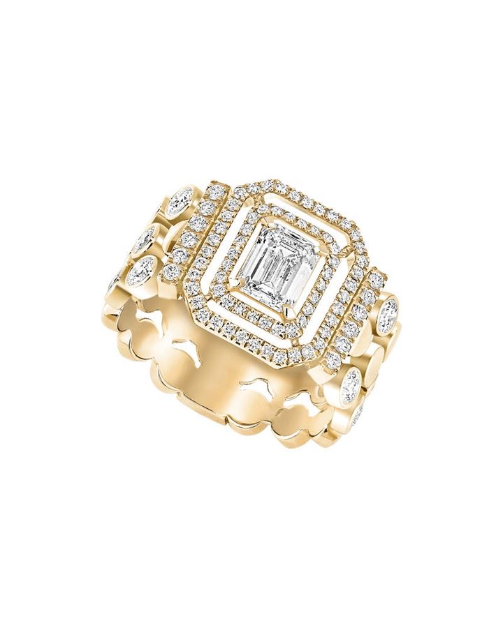 「ムーヴ」コレクションの中でも、特にスペシャルでラグジュアリーなデザインのシグネットリング。ベース部分にダイヤモンドがパヴェセッティングされているだけでなく、センターダイヤモンドの周りにも配され、手を動かすたびに圧巻のきらめきを放つ。