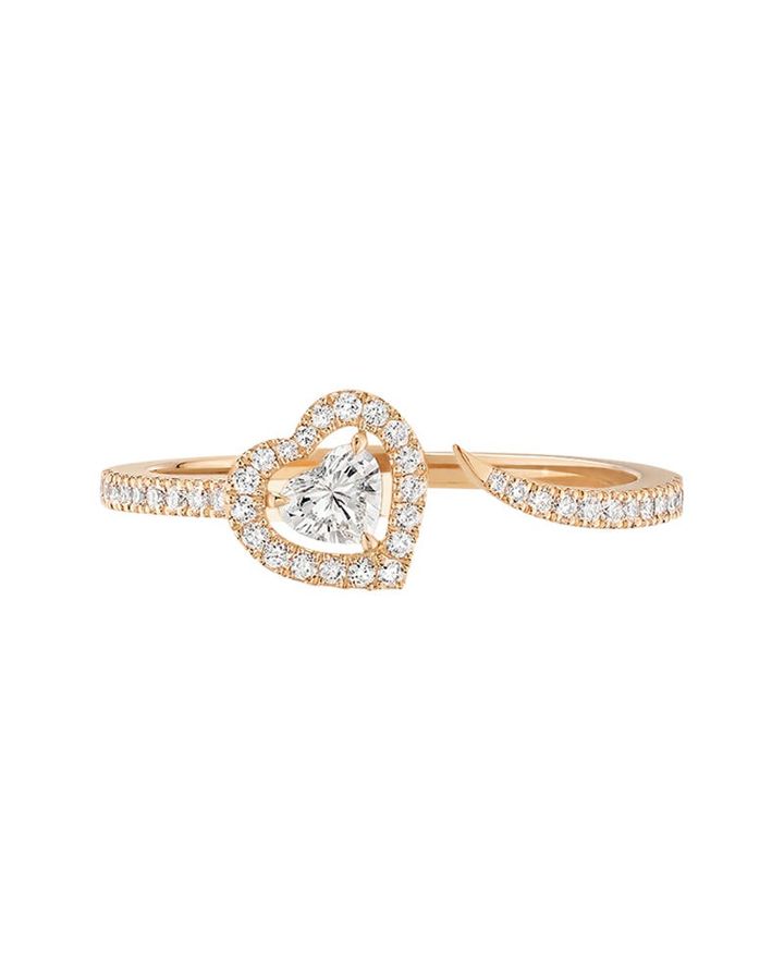 マイクロセッティングされたブリリアントカットのダイヤモンドの縁取りによって、丸みのあるハートシェイプのダイヤモンドの存在感と輝きがより一層美しく映えるソリテールリング。オープンタイプのデザインでアーム部分にもダイヤモンドがパヴェセッティングされ、手元にアイコニックな表情を添える。ウエディングリングとしてもおすすめ。