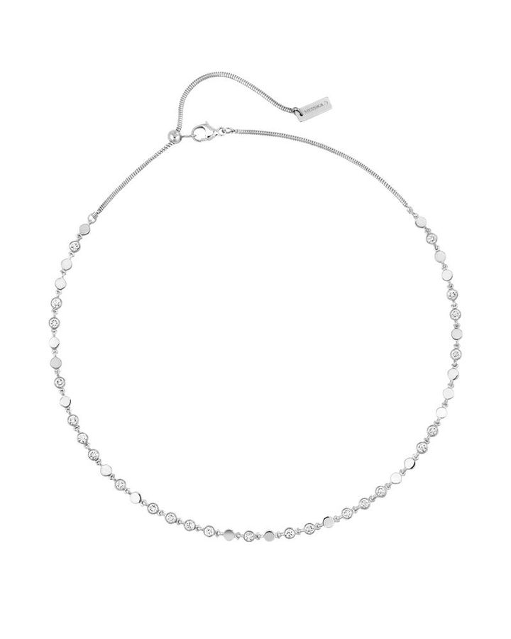ダイヤモンドとホワイトゴールドのメダル状パーツが連なったネックレス。独自のスライディングシステムを採用し、長さが簡単に調節できるため、短くしてチョーカー風に、また少し長めにとアレンジ自在。エレガントなスタイルはもちろん、カジュアルなデイリースタイルなどあらゆるシーンにフィット。