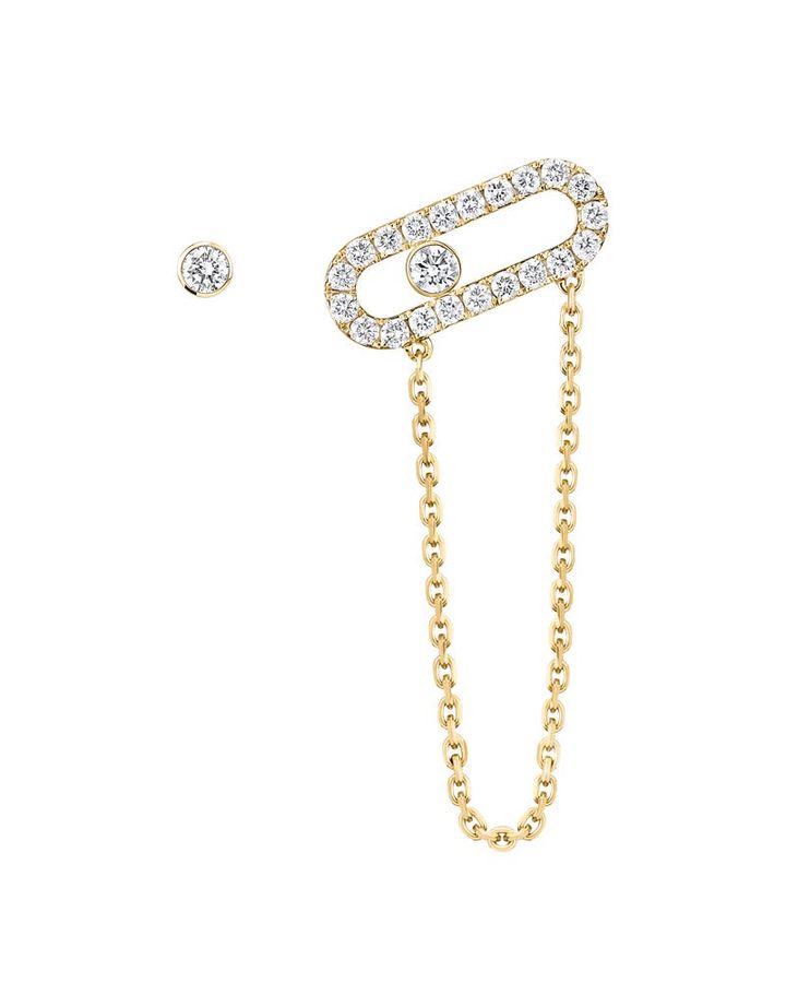 ダイヤモンドセッティングを施した「ムーヴ」モチーフにチェーンがきらめくピアスと、ひと粒ピアスというアシンメトリーなセット。ダイヤモンドとチェーンが放つ軽やかな光と、ミニマルでシンプルなひと粒というバランスが絶妙。片耳に複数のピアスホールがある場合、同じ耳につけてもすてき。