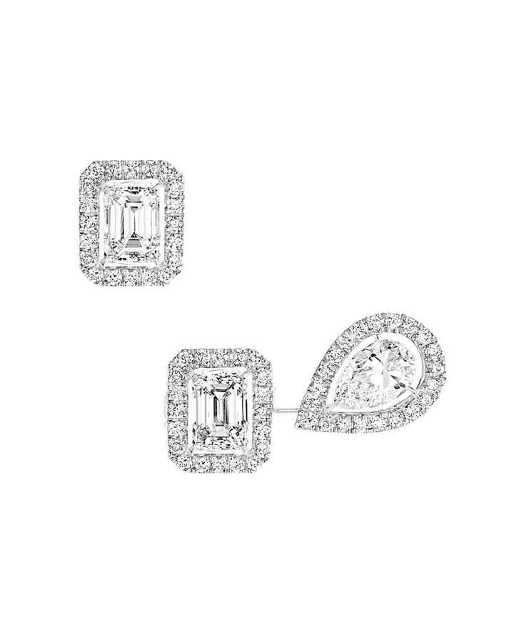 右耳用にはエメラルドカットのダイヤモンド、左耳用にはエメラルドとペアシェイプ、2つのカットのダイヤモンドを配したアシンメトリーのピアス。大粒のダイヤモンドの周りにはメレダイヤモンドがセッティングされ、極上のエレガンスを感じられる。