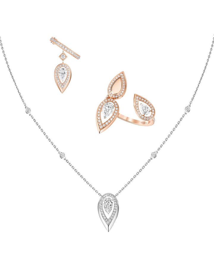 ヴァレリー・メシカがお気に入りのペアシェイプダイヤモンドが鍵となり、それを取り囲むフレームとともに燃え盛る炎のような表情を生み出すコレクション。天地を逆にしたペアシェイプダイヤモンドがポイントで、よりクールでスタイリッシュな印象に。とてもキャッチーで力強さを感じさせるコレクションは、1点使いでもコーディネート全体を引き締める主役ジュエリー。大人っぽい表情で唯一無二の存在感が楽しめる。