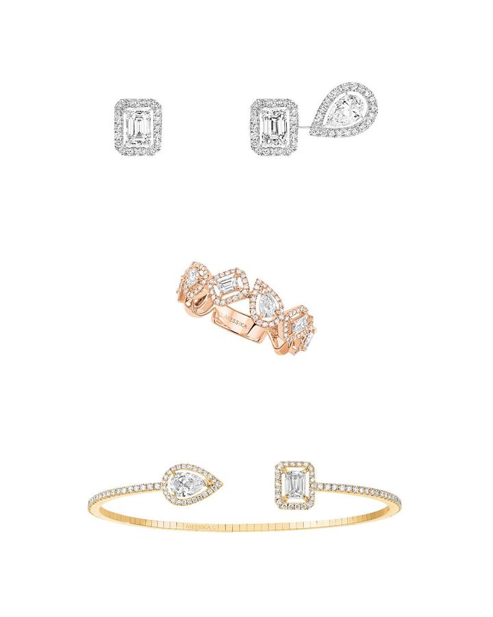 クールでタイムレスなエメラルドカットと、モダンでスタイリッシュなペアシェイプという異なるファンシーカットのダイヤモンドを組み合わせ、トレンド感のあるアシンメトリーのデザインとして昇華。大粒のダイヤモンドの周りには、緻密なセッティング技術によりメレダイヤモンドで取り囲むことで光の輪を生み出し、ダイヤモンドの輝きを最大限に楽しめる。