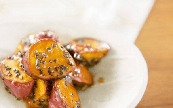 カリッと甘い大学芋は、お弁当にもぴったりの一品。サツマイモは常温の油から揚げていくと、中心まで上手に火が入ります。みつは火を止めた後も余熱で火が入るので、サツマイモを入れたら手早くからめましょう。