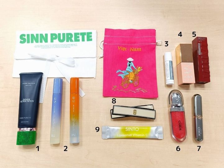 「SINN PURETEのLINEギフトのラッピング巾着と、ベトナムのホイアンで購入した刺繍が可愛い巾着がコンパクトでお気に入り。カラーとデザイン違いで大量に購入したので、こちらは2代目です。なるべく軽量化したいので、メイクアイテムは色持ちや発色がよいものを選びます。フレグランスは、8mLサイズのものを気分に合わせて持ち運ぶようにしています」