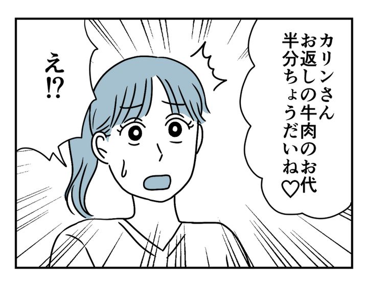 ご近所さんが釣った魚に対するお義母さんのお返しは、デパートで購入した高級なお肉でした。自分のお金でお返しするならまだしも、カリンさんに「半分支払って」と請求してきたお義母さん……。カリンさんは断りたくても断れなかった雰囲気ですが、本当にもったいない出費だったことでしょう。
