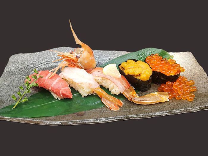 「いきいき五点盛り」(本まぐろ、ぼたん海老、生ずわい蟹、極上生うに、こぼれいくら)(2,880円) 厳選ネタを一皿で味わえる贅沢な御殿盛りです。