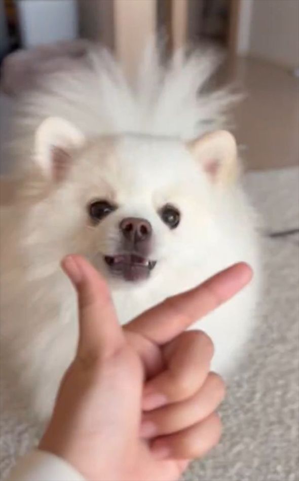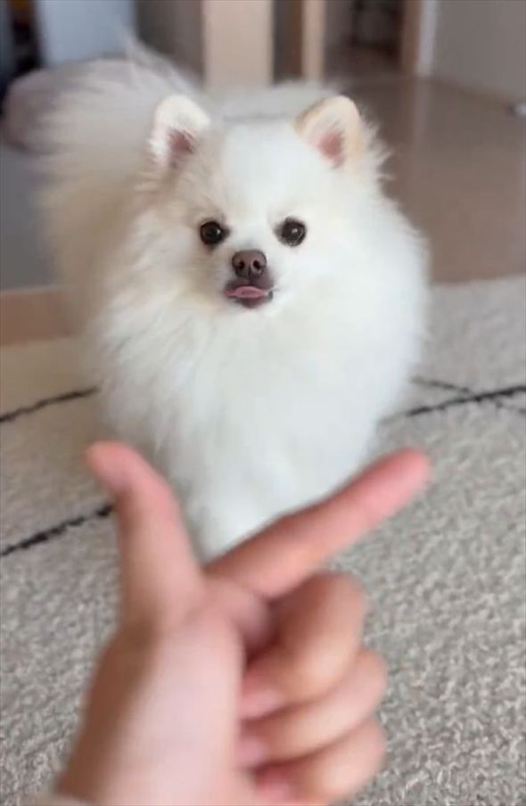 愛犬のポメラニアンに、指をVの字に開いた手を差し出した飼い主さん。 指の間にあごを乗せてもらう、あご乗せチャレンジをするようですが・・・、うまくいくでしょうか!?