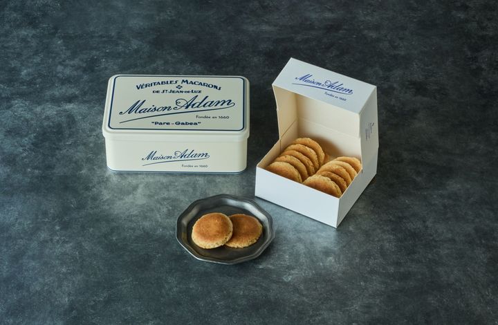 そんな新しい空間で、もっとも注目したいのが、数量限定で登場する「Maison adam(メゾン・アダム)」のマカロン。マカロンというと、カラフルな生地にガナッシュやクリームが挟まれたものを想像するけれど、メゾン・アダムのものはプレーンな見た目が特徴的。フランス・バスク地方で1660年に創業された老舗パティスリーが手がけるこのマカロンは、なんとルイ14世の結婚式にも献上されたという由緒ある逸品。さくっとした食感と、素朴ながらも奥深い味わいは、まさに“元祖”の名にふさわしい逸品。
