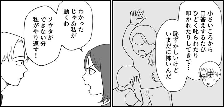 「本当は言い返したいよ。でも母さんには強く言えない。小さいころから口答えするたびひどく叱られたり、叩かれたりしてきたから……。恥ずかしいけど、いまだに怖くて」と自分の気持ちを話してくれたソウタ。小さいころからそんな風に育てられてきたら、怖いに決まってます。ソウタの過去に強い同情心が湧くのを感じます。
