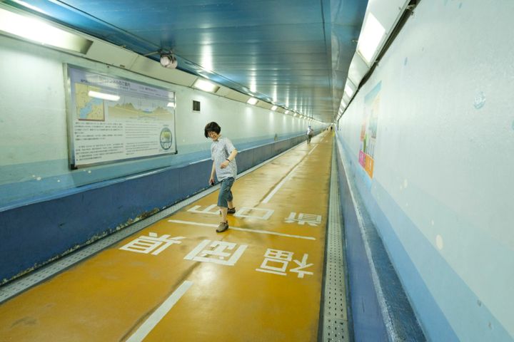 関門海峡の、歩行者や自転車・バイク(押して歩く場合のみ)専用のトンネルをくぐる。