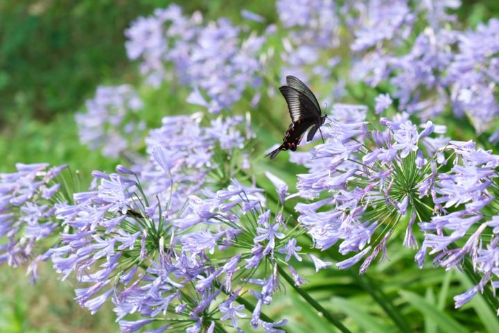 咲き乱れる花に蝶が舞っている。