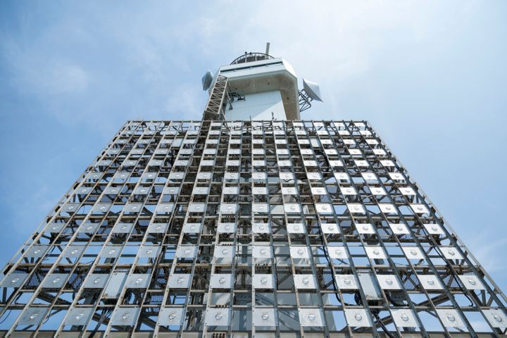 関門海峡のもっとも屈曲した場所に立つ関門海峡海上交通センター。真っ青な空に突き刺さるように伸びるタワーの下に、要塞のような階層の建物がどんと聳えている。