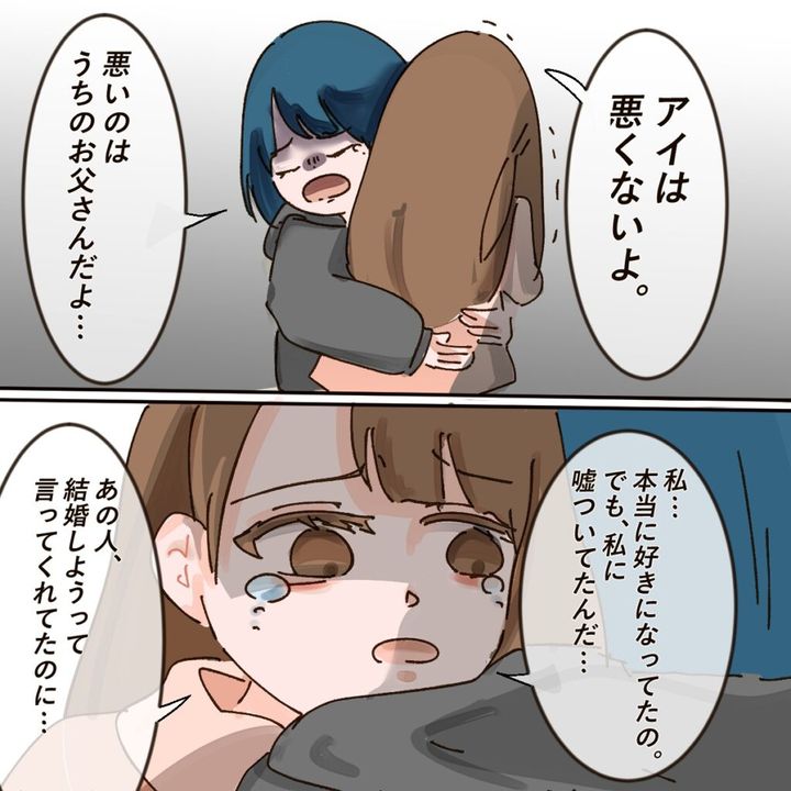 「アイは悪くないよ。悪いのはうちのお父さんだよ・・」サキがそう言うと、「私・・本当に好きになってたの。でも、私に嘘ついてたんだ・・。あの人、結婚しようって言ってくれてたのに・・」アイさんはそう言いながら、涙をぽろぽろこぼしました。