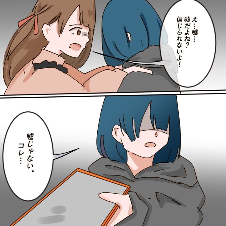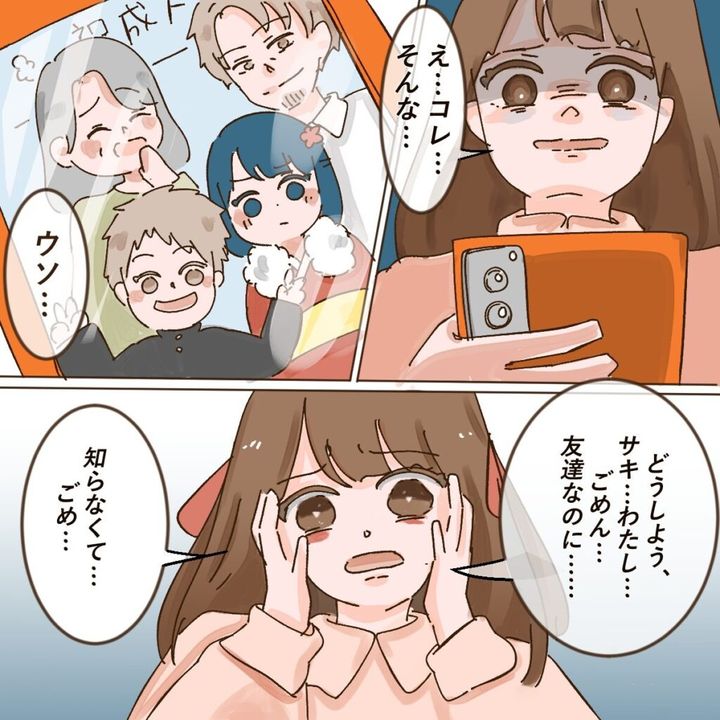 「どうしよう、サキ・・わたし・・ごめん・・友達なのに・・知らなくて・・ごめ・・」写真を見て動揺するアイさんに、